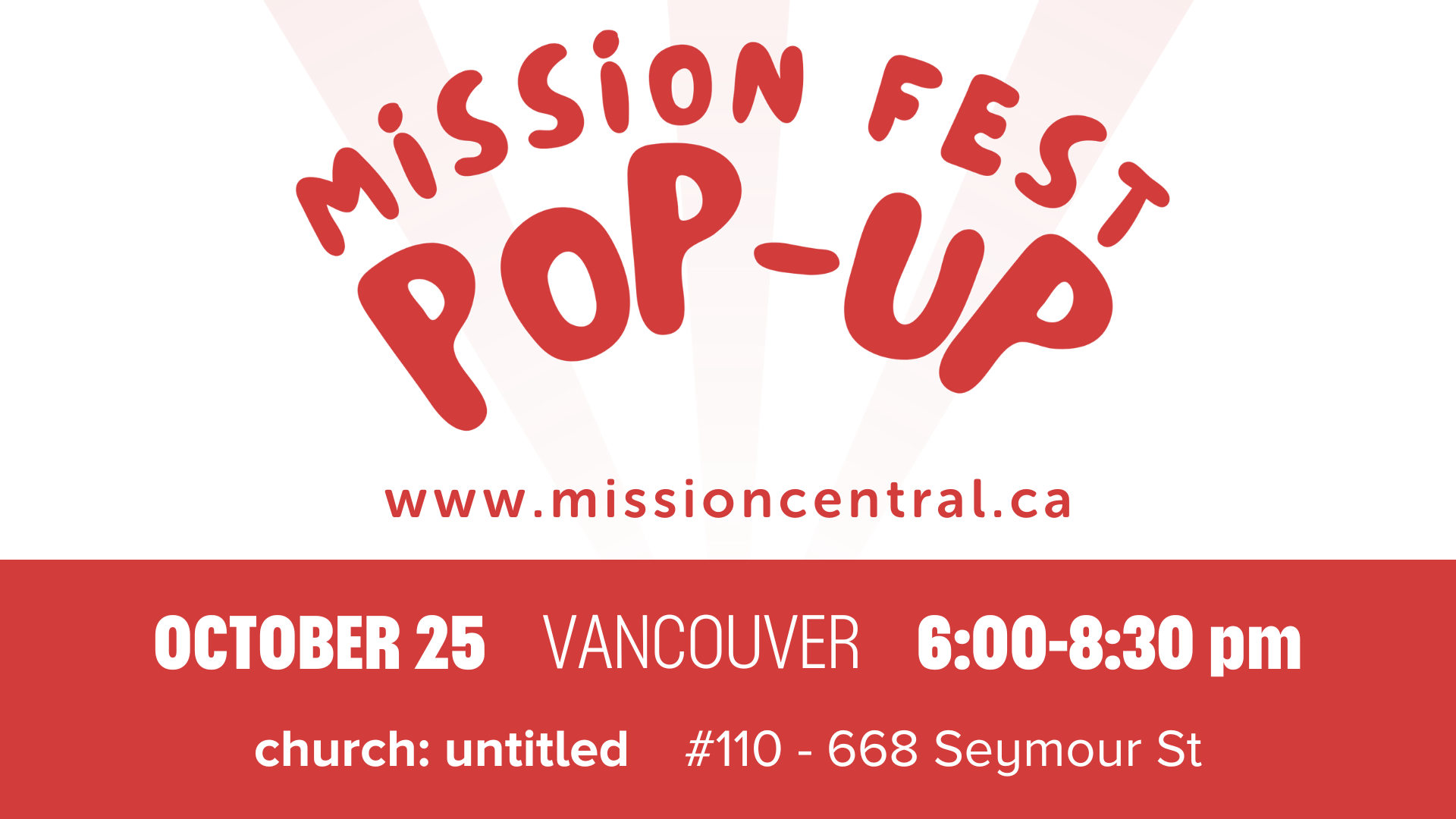 These one-night gatherings will include worship, testimonies, preaching, and an opportunity to listen together for how God is inviting us all to participate. Join us on in Downtown Vancouver on Saturday, October 25th, or in North Vancouver on Saturday, November 1st, For more details, visit missioncentral.ca.