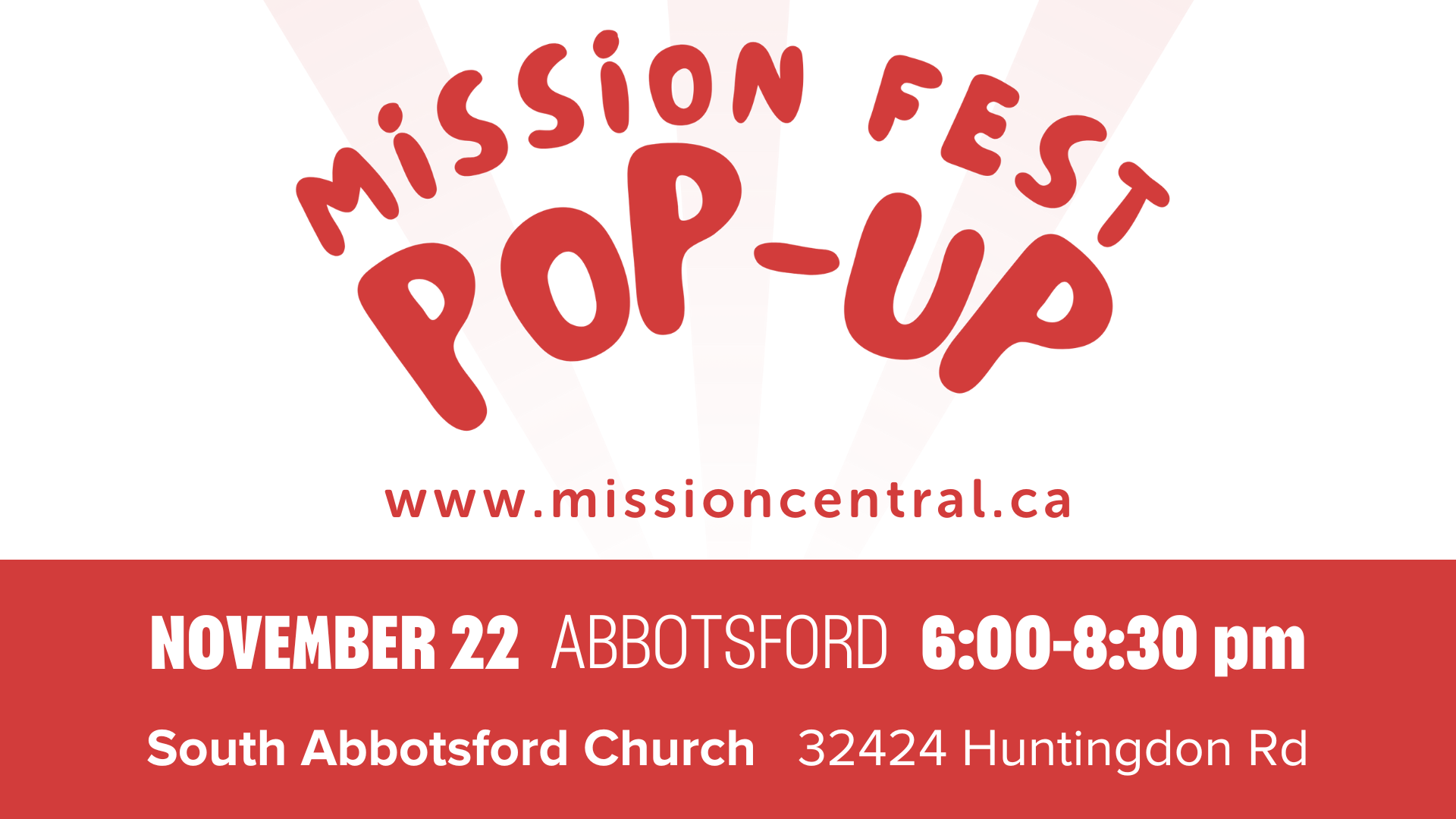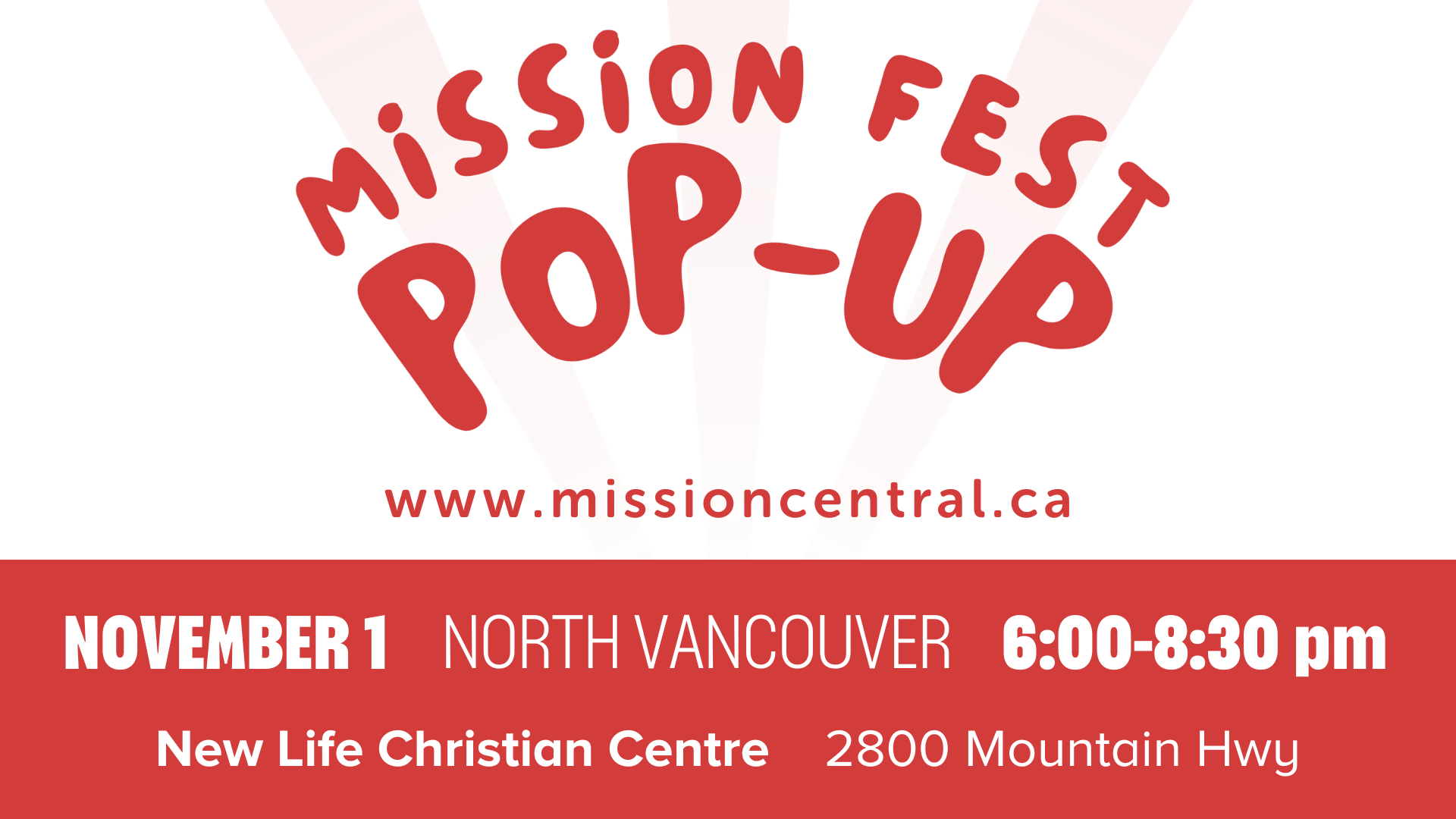 As you know, there are many ways we’re involved with Global Missions. One ministry we want to highlight this morning is Mission Central, and the Mission Fest conference. If you’ve never heard of Mission Fest, it’s a 3 day conference where Missionaries, people passionate about Missions, and dozens of Mission Agencies come together, all united around the presence and mission of Jesus in the world. There will be an Exhibit hall to explore, preaching and worship sessions, a youth rally and more. This Fall, Mission Central is also hosting “Mission Fest Pop-Ups” as the lead-up to Mission Fest BC in February, and to share their vision and heart for the conference in February.